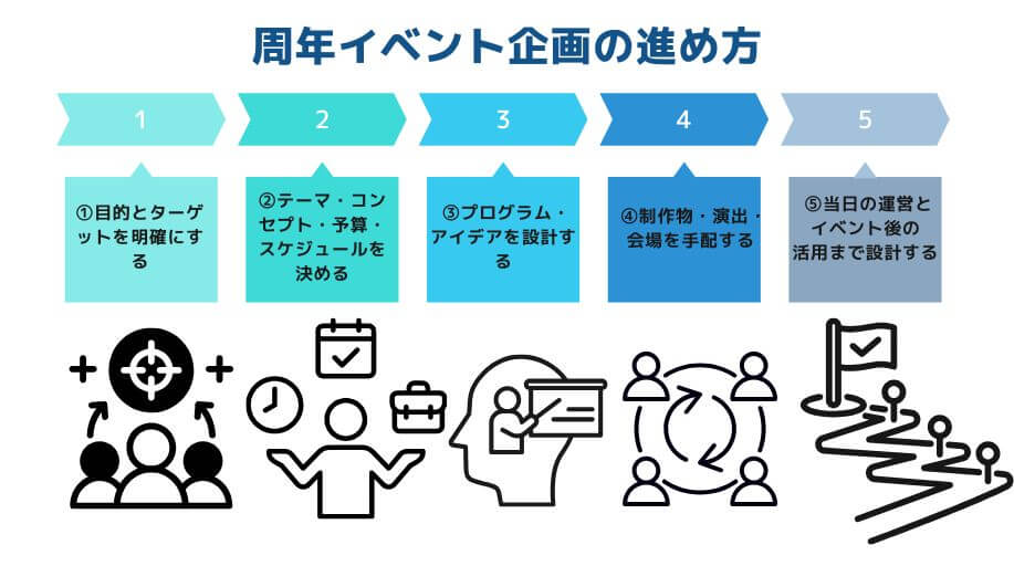 だからこそ、最初に「全体の地図」を持っておくことが大事です。周年イベントの企画は次のステップで進むのがおすすめです。
