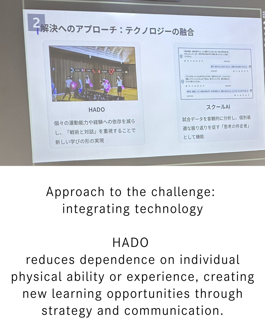 It was particularly impressive that all students in the special education classes responded that they “had fun,” and that there was a shift in attitude from “exercise is hard” to “exercise is fun.” The presentation effectively conveyed the vision of “physical education where everyone can participate with a role,” transcending skill differences, disabilities, grade levels, and the constraints of a large school, all through HADO.