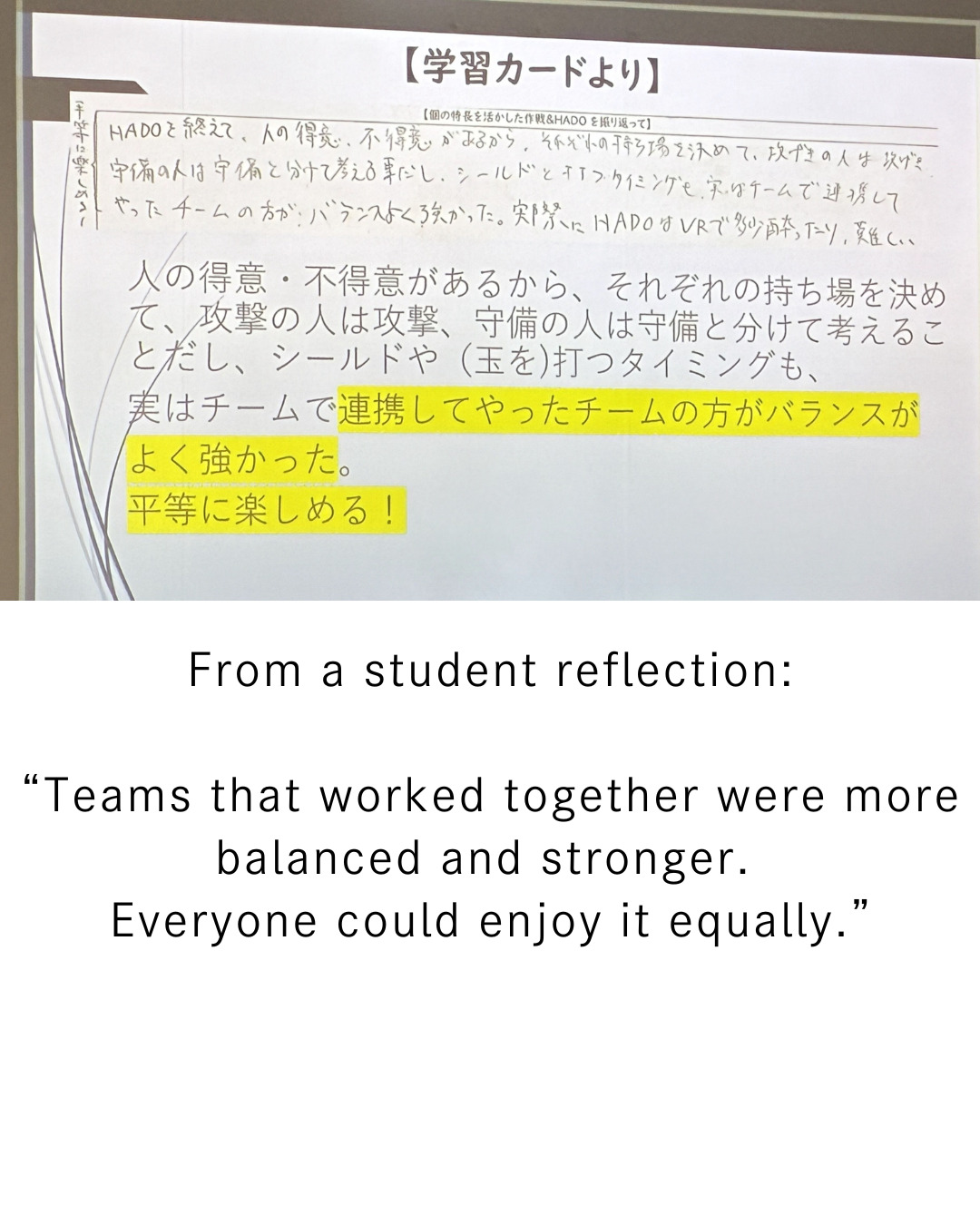 Furthermore, as the lesson progressed, it was shown that students taught each other about timing, roles, and defensive techniques, and realized the strength of a cohesive team. Learning cards included comments such as “The team that worked together was more balanced and stronger” and “It’s enjoyable for everyone,” indicating that the structure, where awareness and consultation contribute to the team rather than simply ranking based on skill differences, naturally fostered mutual teaching among students.