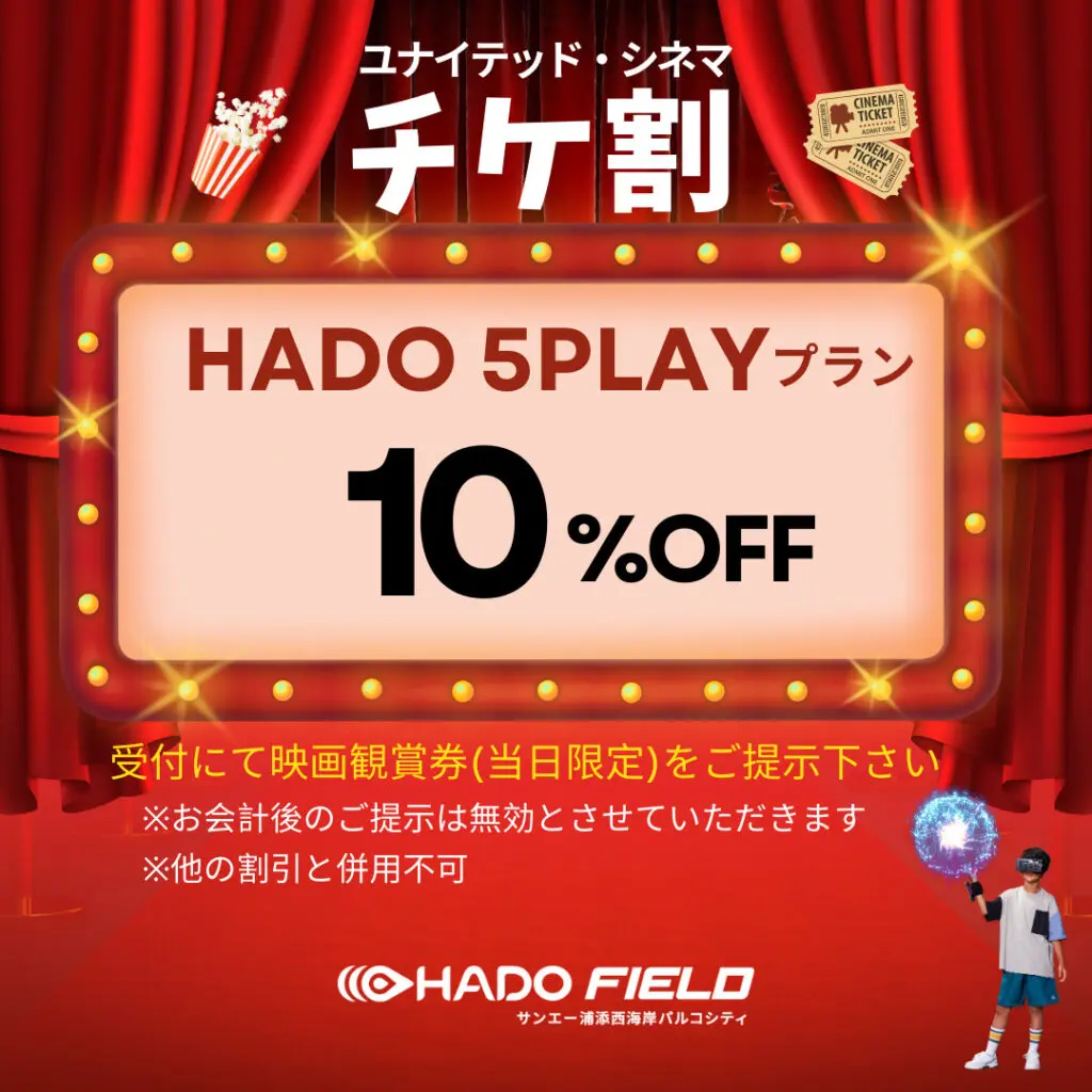 ユナイテッド・シネマの映画観賞券(当日限定)提示で、なんと「HADO 5PLAY」が10%OFFになりますよ🙌