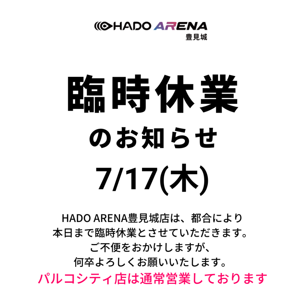 7月17日(木)HADO ARENA豊見城店は、都合により臨時休業とさせていただきます。※HADO FIELDパルコシティ店は通常営業しております。(13時~20時)ご迷惑をおかけしますが、何卒ご了承の程よろしくお願いいたします🙇
